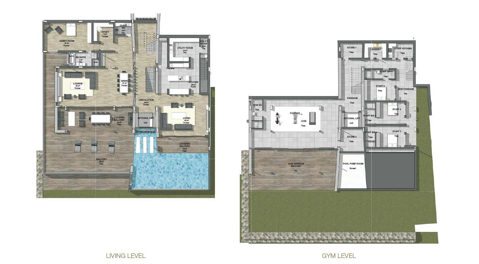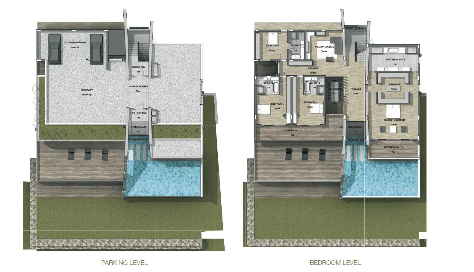 Four storey villa, five bedroom en suite, study, staff quarters, porte cochere, three covered parkings, plus visitors’ bays on the roof, lift, private garden, private pool, gym/entertainment room, access to lower part of site and free-growing garden. Solar heating. Four available.